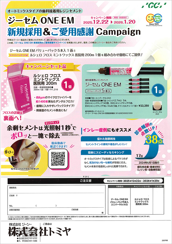 『ジーセム ONE EM バリューパック』5本入1函と、キャンペーンセット品「ルシェロ フロス ミントワックス 医院用 200m」1個を組み合わせ価格でご提供します!
