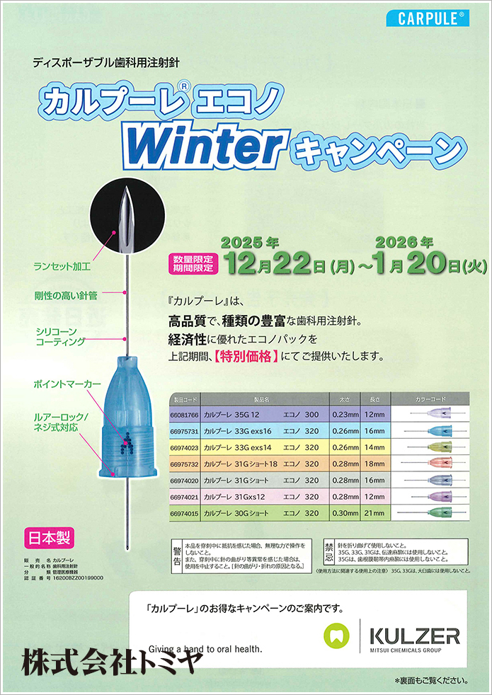 『カルプーレ』は高品質で種類の豊富な歯科用注射針です。経済性に優れたエコノパックを特別価格でご提供いたします!