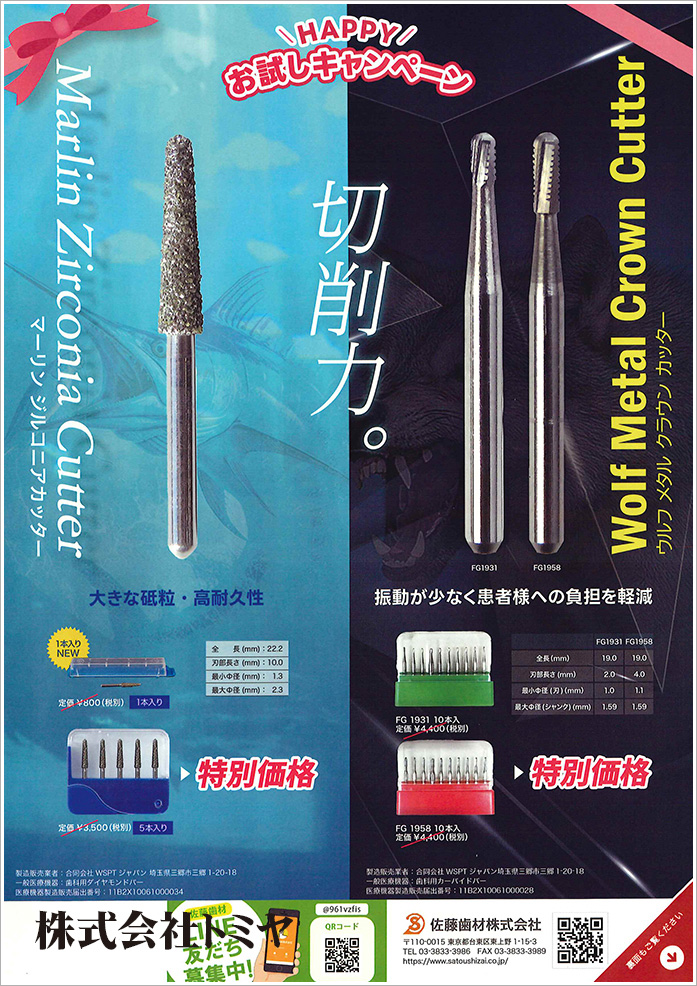 『マーリン ジルコニアカッター』『ウルフメタル クラウンカッター』のお試しキャンペーン、印象体・吸引除菌キャンペーンを実施します!