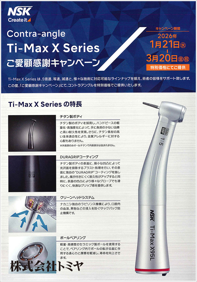 『Ti-Max X Series』は、5倍速、等速、減速と、様々な施術に対応可能なラインナップを揃え術者の皆様をサポート。この度、コントラアングルを特別価格でご提供するキャンペーンを実施いたします!