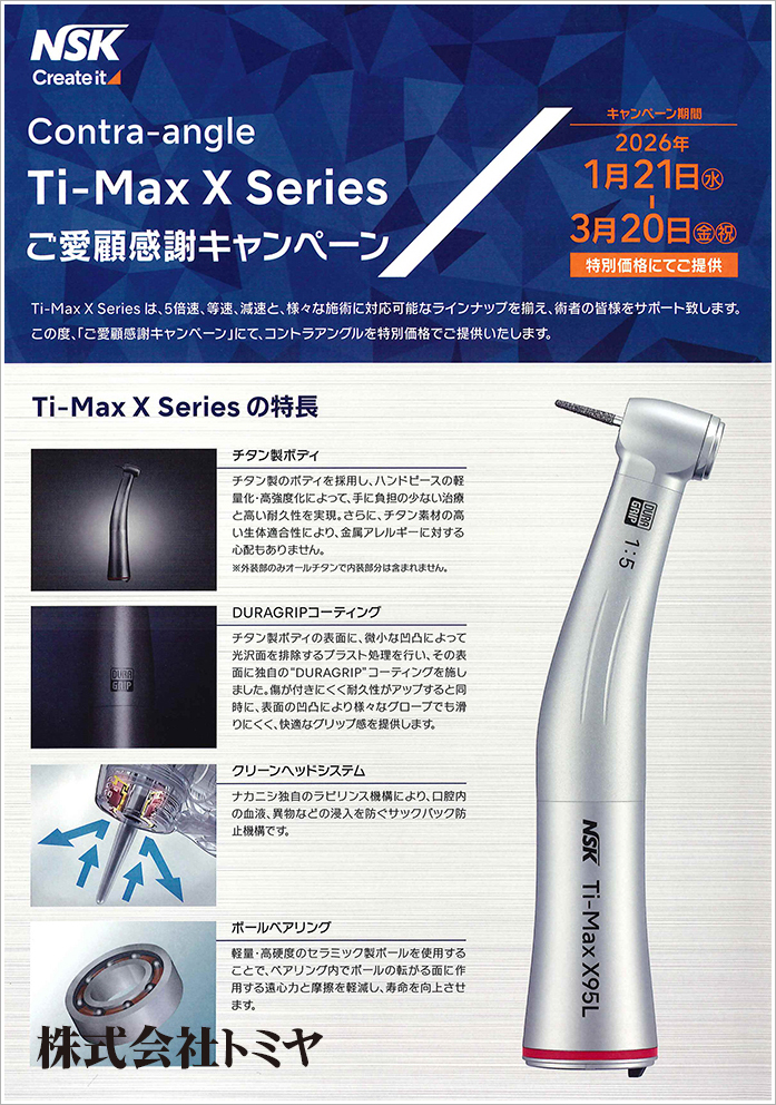 『Ti-Max X Series』は、5倍速、等速、減速と、様々な施術に対応可能なラインナップを揃え術者の皆様をサポート。この度、コントラアングルを特別価格でご提供するキャンペーンを実施いたします!